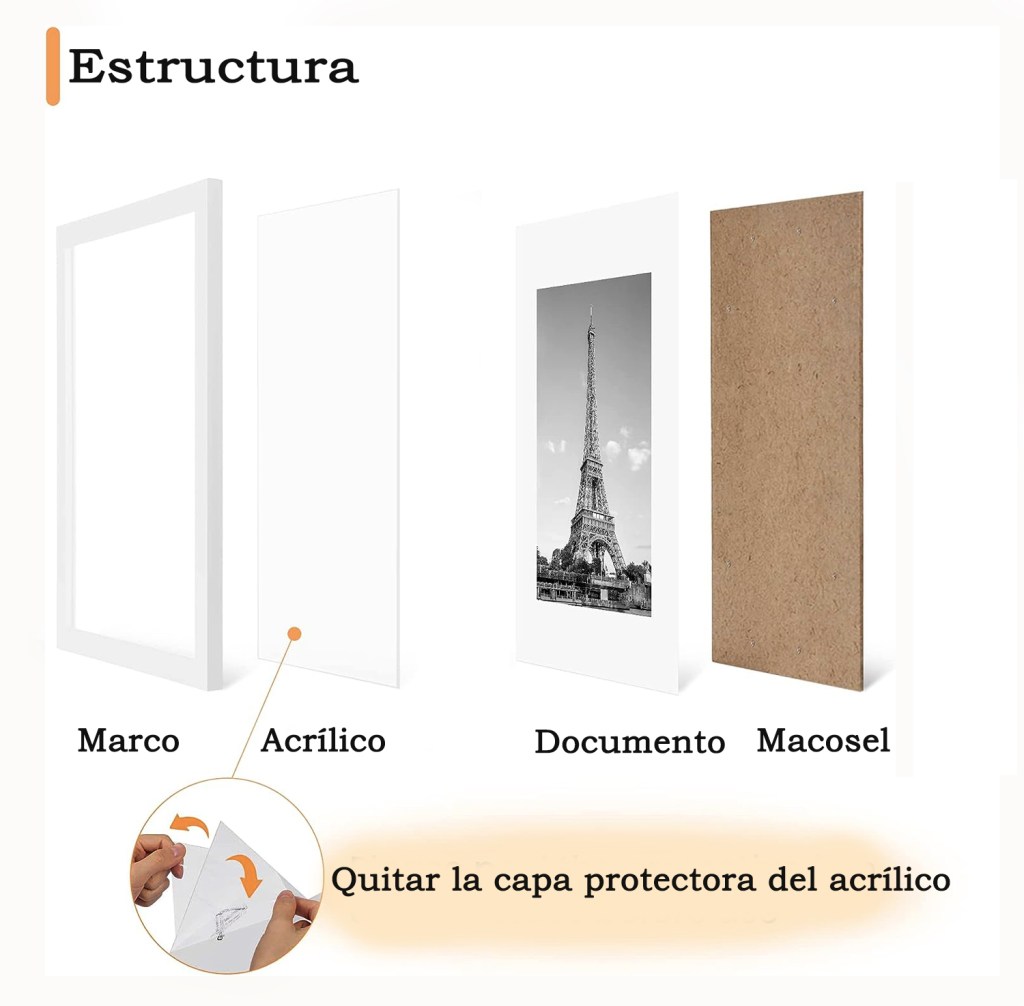 MATERIAL PREMIUM: Las molduras están hechas de poliuretano de alta calidad, duradero y respetuoso con el medio ambiente. El plexiglás de alta definición, protege sus fotos del polvo, la humedad y los arañazos, para que se conserven perfectas durante años.